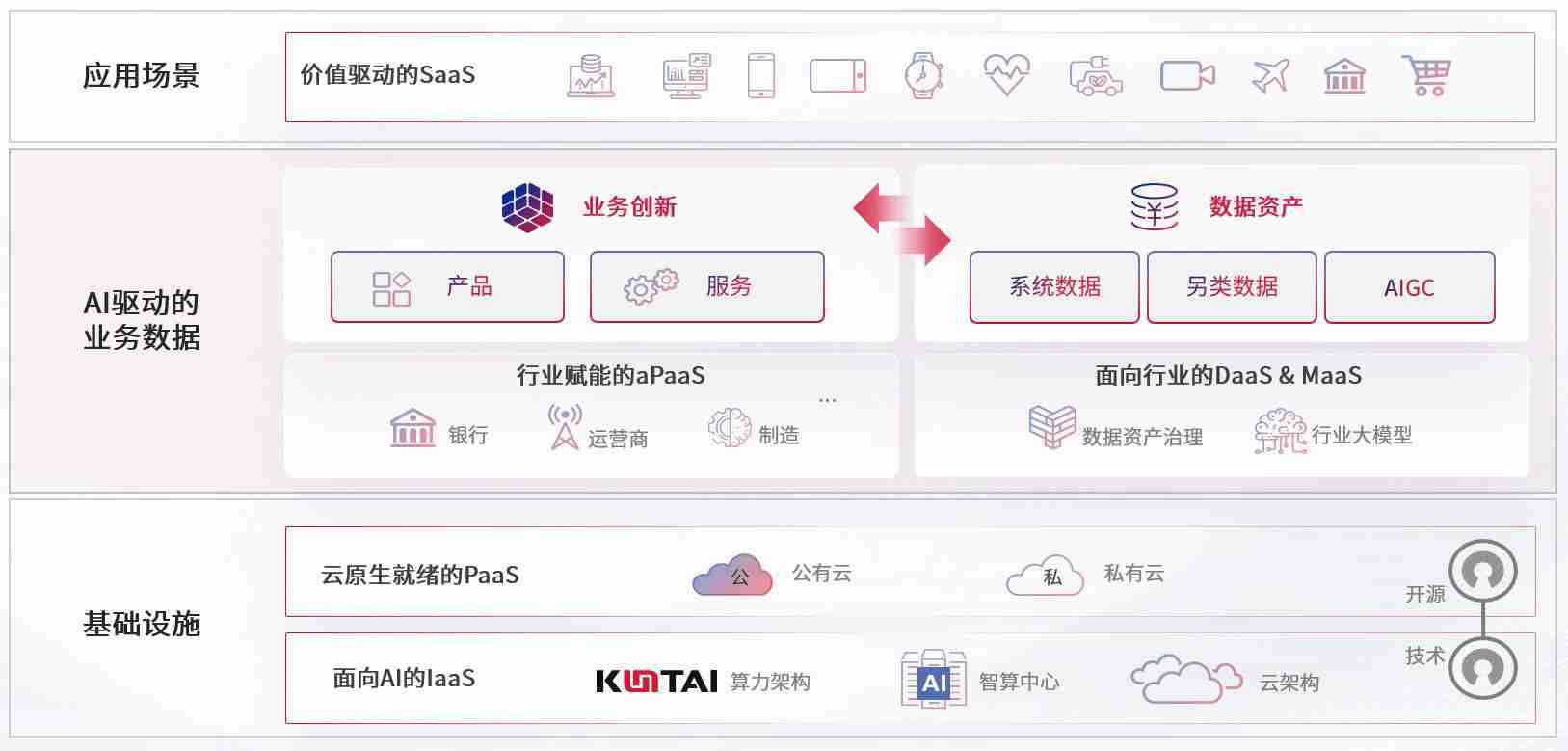 数字时代,,围绕企业数字化转型的关键要素,,,优游UB8数码开创性的提出数云融合战略和技术体系框架,,,着力在云原生、、、数字原生、、AI原生和信创产业上架构产品和服务能力,,,,为处在不同数字化转型阶段的快消零售、、、汽车、、金融、、、医疗、、、、政企、、、教育、、、、运营商等行业客户提供泛在的敏捷IT能力和融合的数据驱动能力,,,,构建跨界融合创新的数字业务场景和新业务模式,,,,助力企业级客户建立面向未来的核心能力和竞争优势,,全面推动社会的数字化、、智能化转型升级。。。。